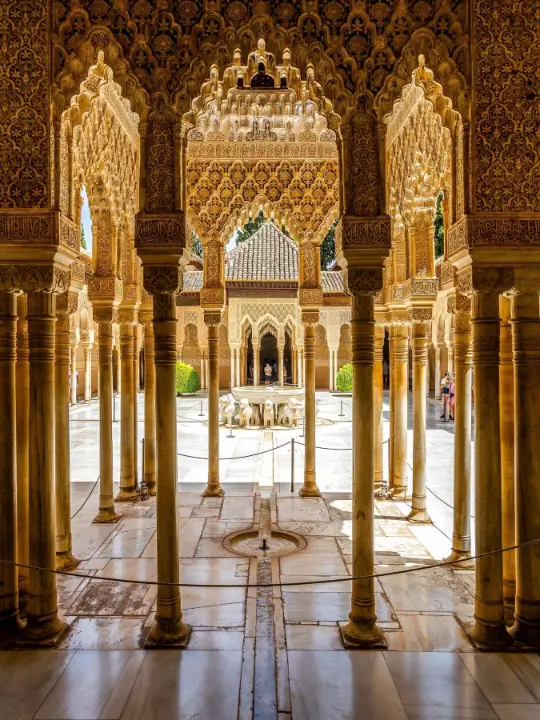 Esplendor Nazarí (S. XIII-XV): Al-Ahmar consolidó la Alhambra como una ciudad palatina independiente, protegida por murallas y torres. Su desarrollo alcanzó la perfección arquitectónica con Yusuf I y Muhammad V, responsables de los patios y salas más emblemáticos que hoy admiramos.